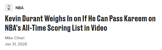 想要超越詹姆斯42821分的历史总得分纪录,看起来并不现实,但杜兰特与贾巴尔38387分的纪录之间的差距,处于更具可行性的追赶范围内。